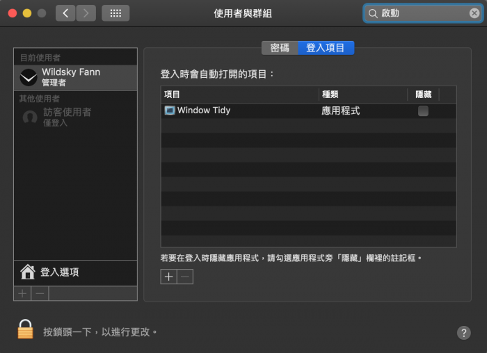 如果覺得每次開機後都要關掉一堆程式有點煩,可以來查看一下自己的「登入項目」,位置在 左上蘋果圖標 > 系統偏好設定 > 使用者與群組 > 登入項目 把不需要每次開的程式從列表中移除。