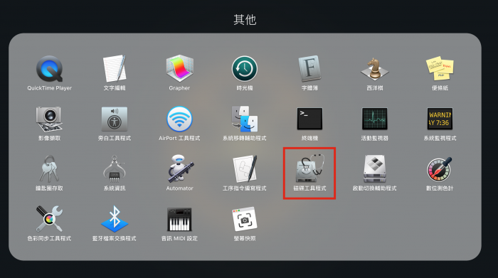 可以用 spotlight 搜尋 disk 或是在 Launchpad 的「其他」中找到。