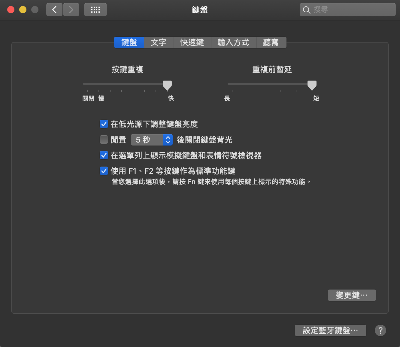 加速鍵盤按鍵重複的速度,設定於 左上蘋果圖標 > 系統偏好設定 > 鍵盤 > 鍵盤。「按鍵重複」和「重複前暫延」都可以調到最快最短,這樣輸入重複的東西就不用一直按按按鍵盤可以直接按著。(在 Vim 中移動 Cursor 時速度會加速超多)