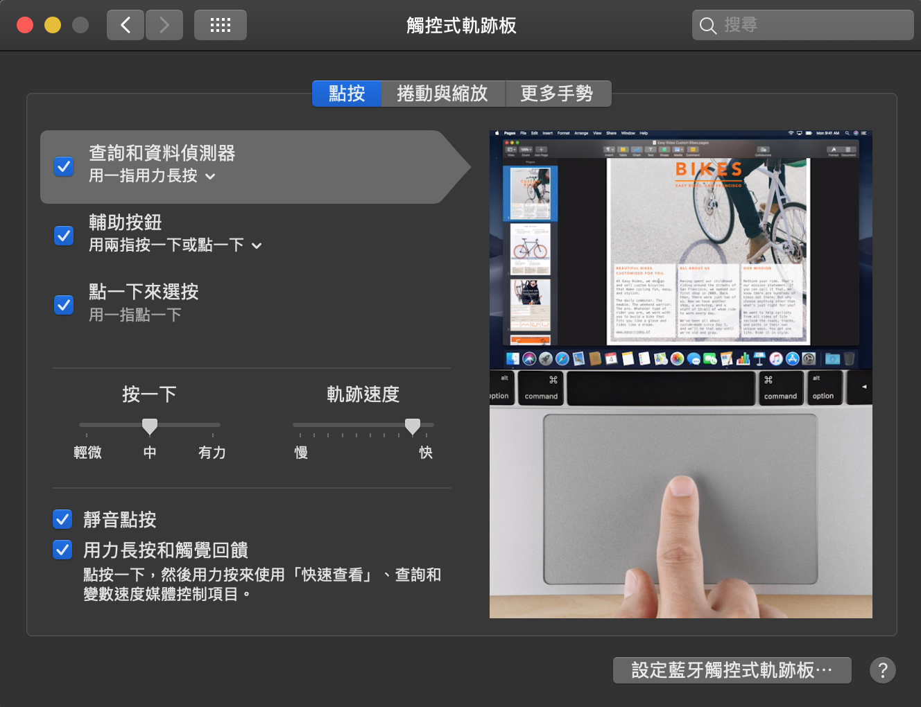 此外,也可以加速游標移動速度,設定於 左上蘋果圖標 > 系統偏好設定 > 觸控式軌跡板 > 點按 裡面的 軌跡速度,我自己是調到最快,這樣移動會超級隨心所欲。